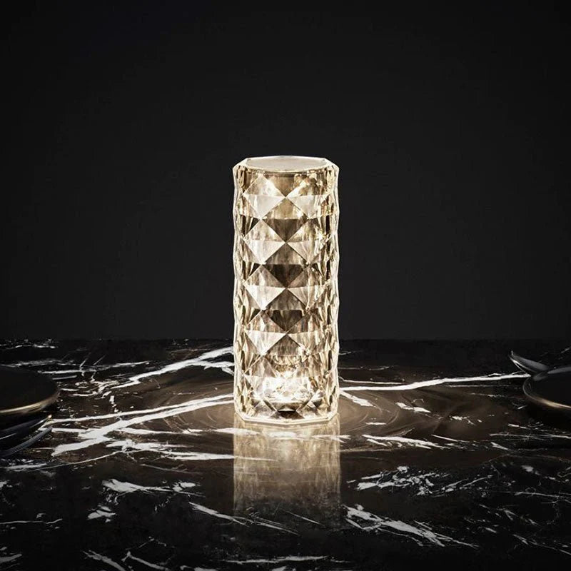 Rose Diamond Crystal Table Lamp in Cristal finish features three light intensities, is rechargeable, and has up to 12 hours of battery.